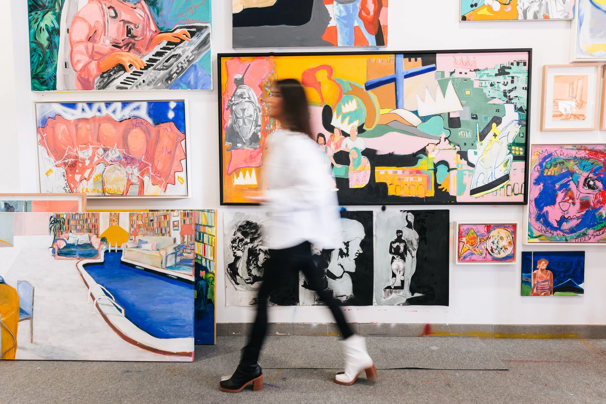 Maria José constructs her paintings in layers, using acrylics to create dynamic, energetic compositions. Each piece builds upon sketches, images, and ideas, exploring everyday themes while pushing them in fresh, imaginative directions. Her work is a celebration of color and movement.